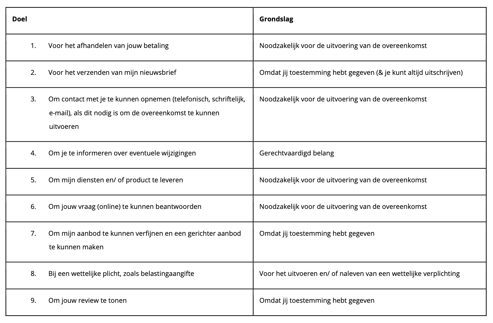 Persoonsgegevens verwerken is onder de huidige privacy wetgeving niet zomaar toegestaan. Om jouw persoonsgegevens te mogen verwerken moet ik bepaalde doelen hebben bepaald en dat heb ik ook gedaan.