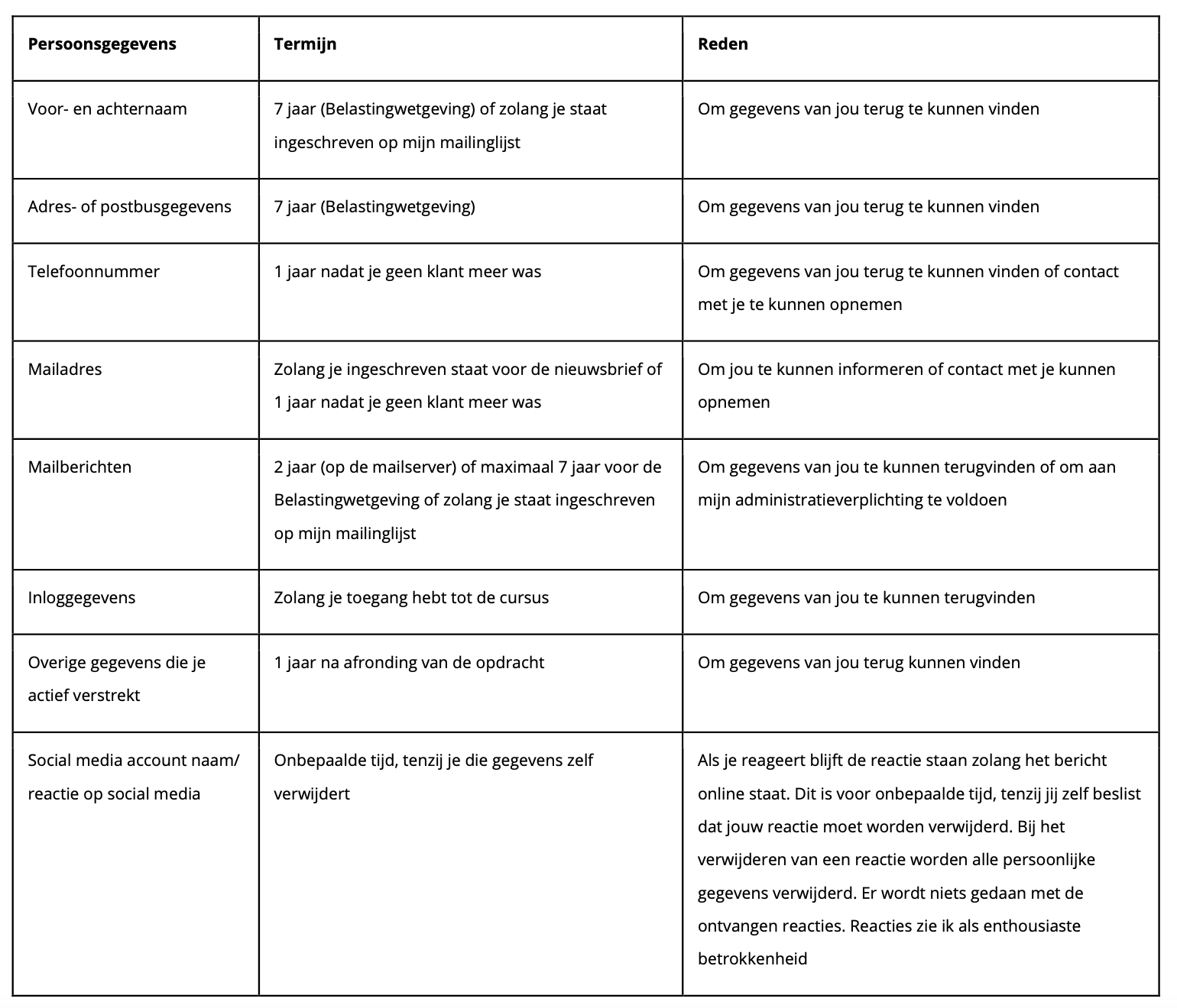 Ik bewaar jouw (persoons)gegevens niet langer dan strikt noodzakelijk om de voorgenoemde doelen te realiseren, waarvoor je gegevens worden verzameld. Ik hanteer de volgende bewaartermijnen: