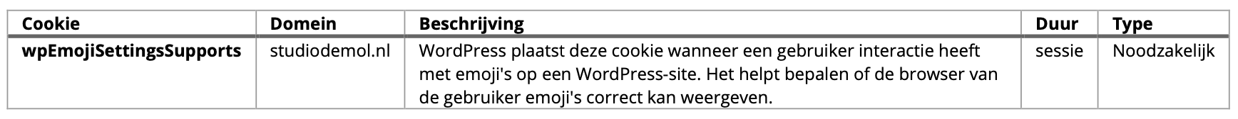 Het kan voorkomen dat via mijn websites cookies worden geplaatst door anderen, waarvan ikzelf niet altijd op de hoogte ben. Kom je cookies tegen die je niet kunt terugvinden in mijn overzicht? Laat het mij weten via info@studiodemol.nl of neem rechtstreeks contact op met de derde partij. Vraag dan welke cookies ze plaatsten, wat de reden is, wat de levensduur van de cookie is en op welke manier ze je privacy gewaarborgd hebben.